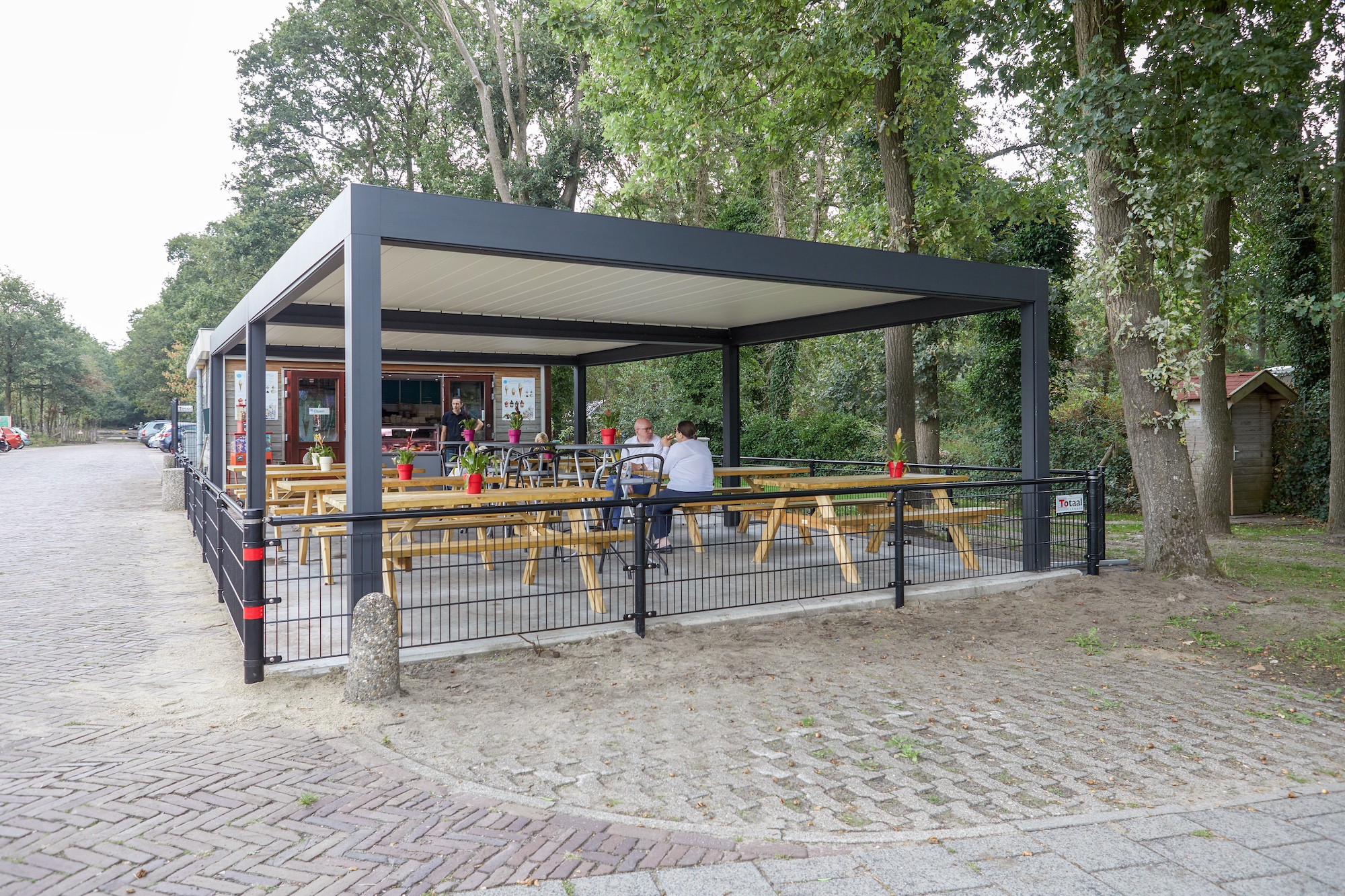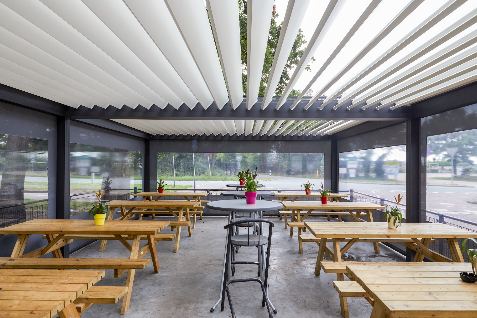 Ambiance Van der Wal bood de perfecte oplossing: een dubbele lameloverkapping van het type Camargue van het merk Renson. Deze overkapping is ideaal voor horecalocaties zoals snackbars, waar flexibiliteit essentieel is. De lamellen kunnen op zonnige dagen gekanteld worden om de warmte te laten ontsnappen en schaduw te creƫren, terwijl het dak op regenachtige dagen volledig dicht kan, waardoor het terras droog blijft.