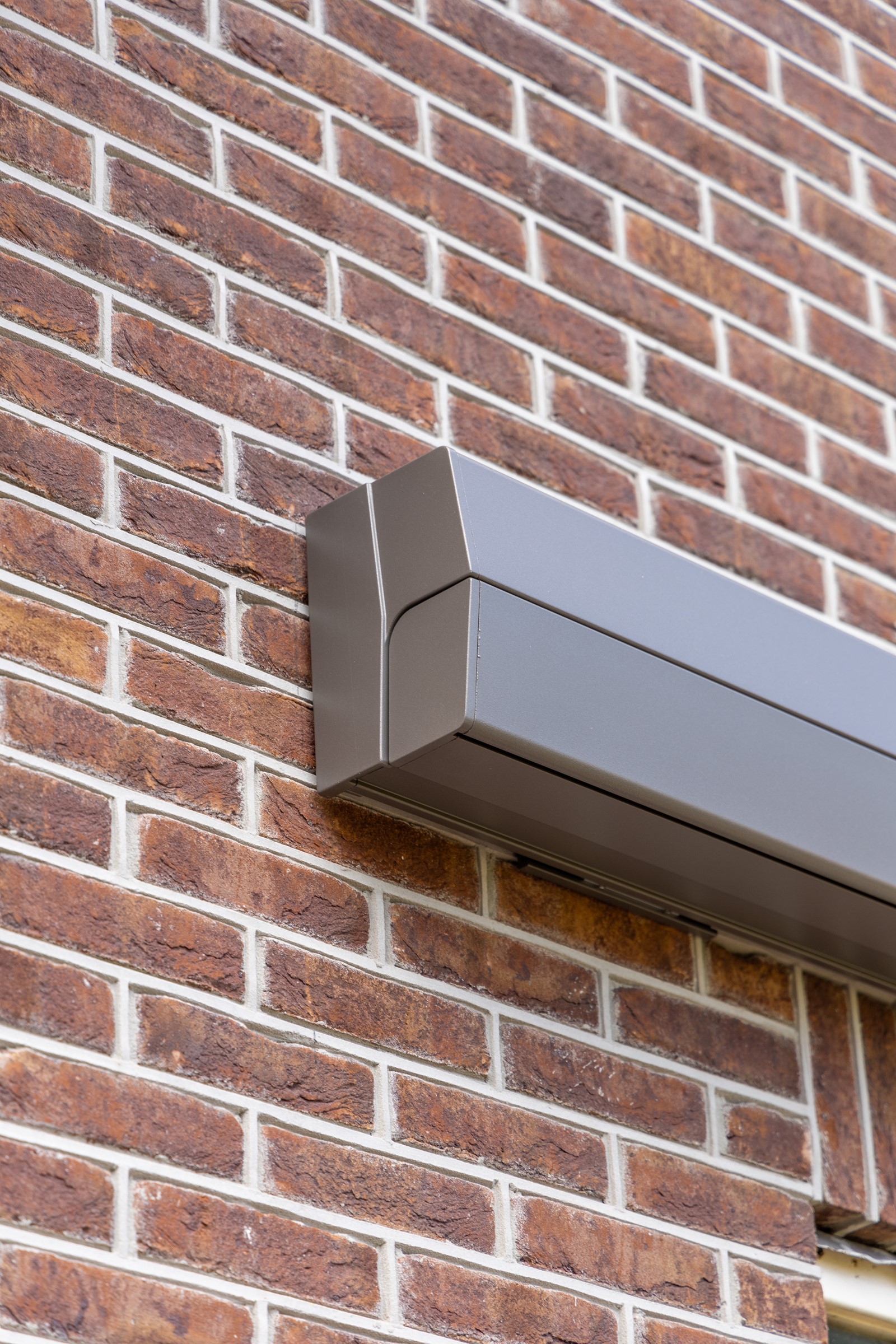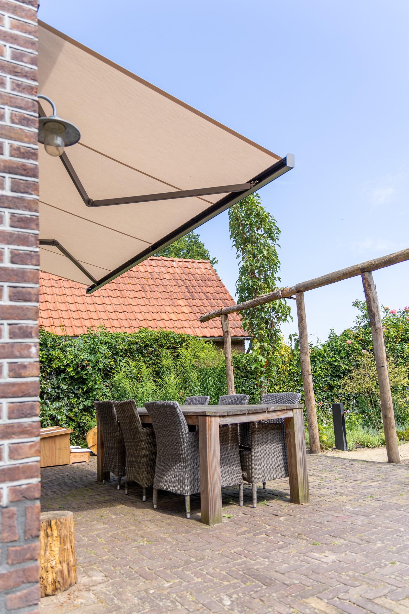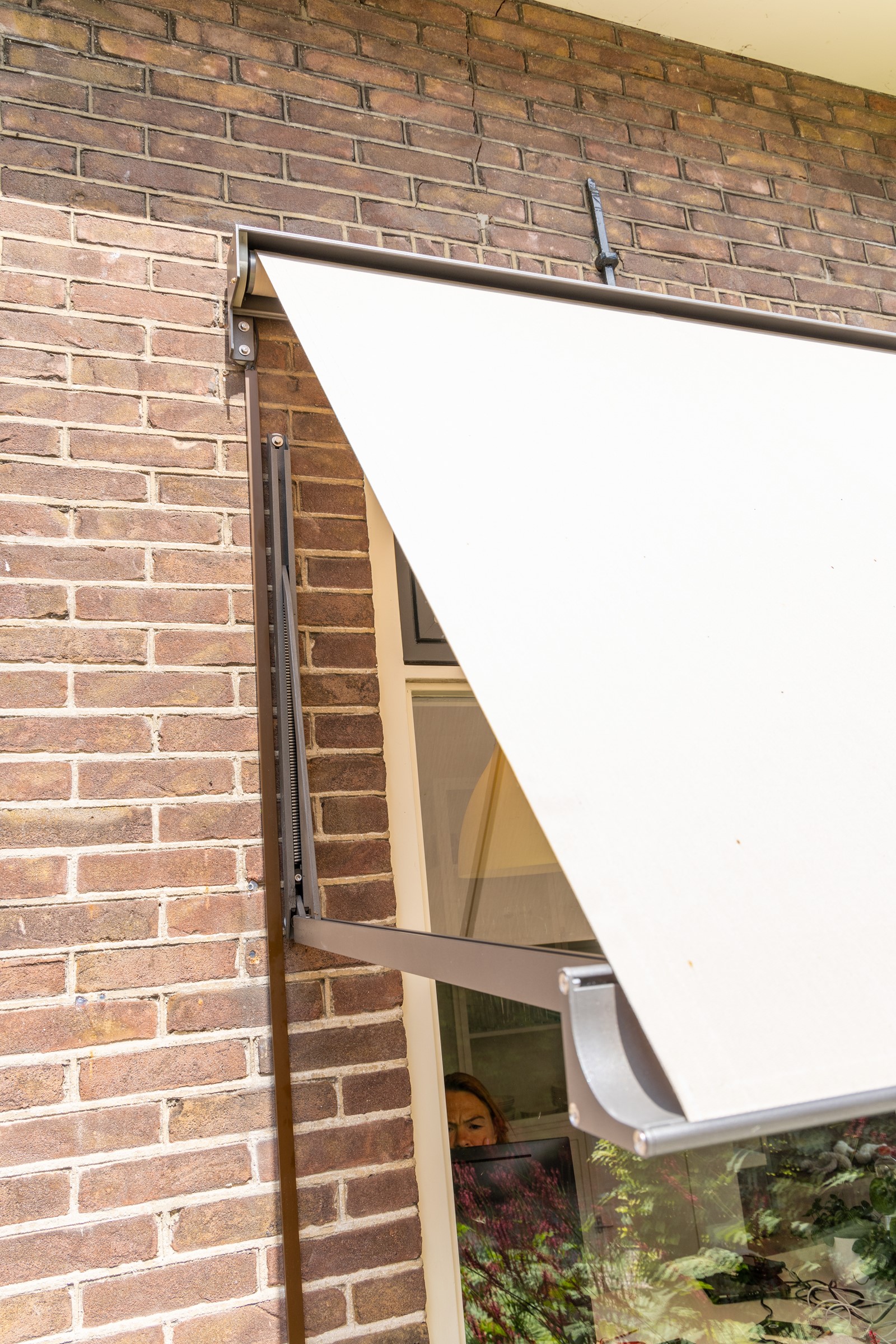 Naast het knikarmscherm hebben we aan de zijkant van de woning uitvalschermen geïnstalleerd om direct zonlicht buiten te houden, waardoor het binnenklimaat ook op warme dagen aangenaam blijft. Zowel het knikarmscherm als de uitvalschermen zijn volledig elektrisch en eenvoudig te bedienen via een handige app. Hierdoor kunnen de klanten de schermen zelfs op afstand in- of uit sturen, wat het risico op windschade aanzienlijk verkleint.
