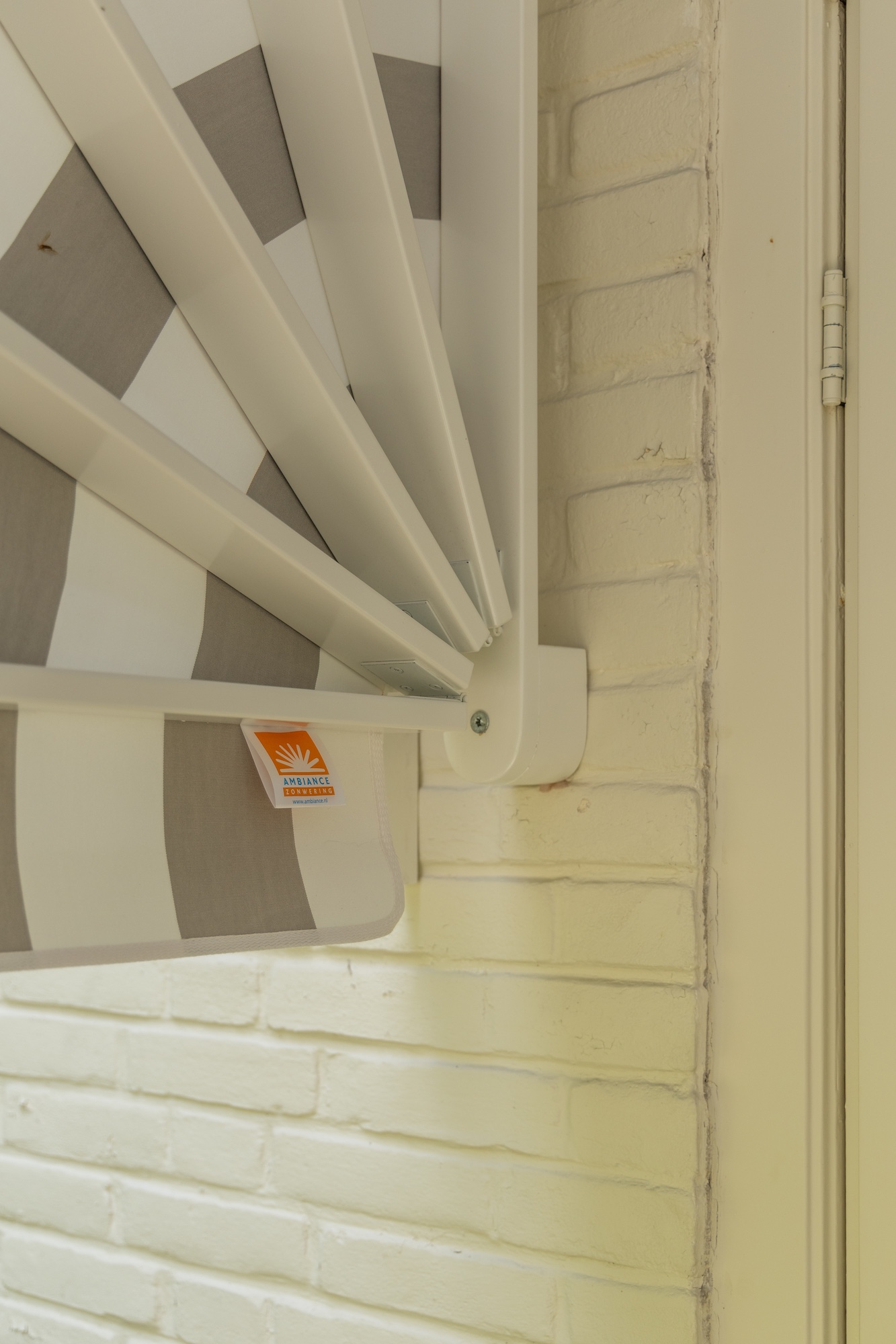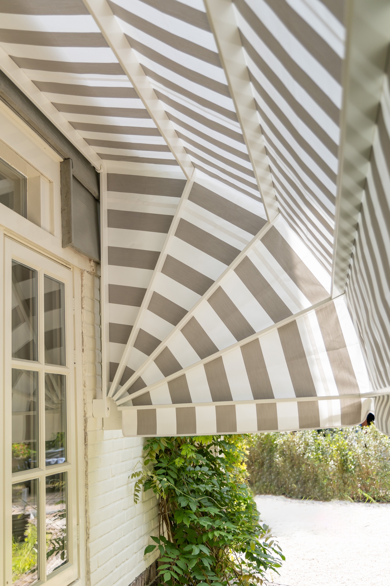 De familie Klaassen koos voor een elektrische bediening, wat hen het gemak biedt om de markies met een afstandsbediening of smartphone te bedienen. Ze waren eerder terughoudend over het advies van onze adviseur Daniel de Wild om de kleur van het doek af te stemmen op het blauw-grijze houtwerk van hun gevel. Uiteindelijk kozen ze voor een combinatie van blauw-grijs met witte blokstrepen, die perfect aansluit bij het schilderwerk en toch veel licht doorlaat zonder dat het binnen te warm wordt.