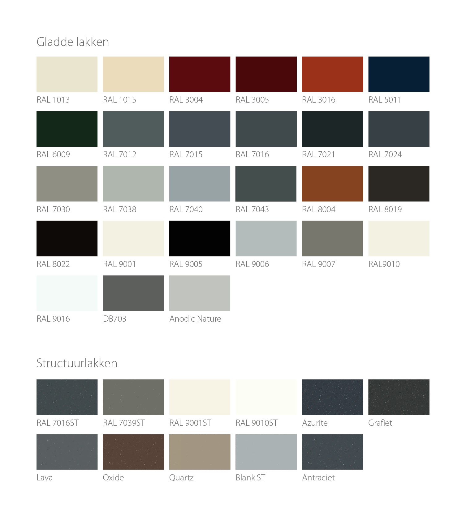 De profielen van onze zonwering zijn standaard kleurgecoördineerd, waarbij we een keuze maken uit de Luxaflex® Outdoor Colour Collection, die we speciaal voor jou hebben samengesteld. Deze bevat 38 kleuren waaronder prachtige, exclusieve matte structuurlakken. Deze Colour Collection wordt geleverd zonder meerprijs. Wil je een (RAL)-kleur die niet in deze selectie zit? Deze is op aanvraag en tegen meerprijs leverbaar. Dit biedt jou nóg meer mogelijkheden om je Luxaflex® Outdoor product persoonlijk te ontwerpen.