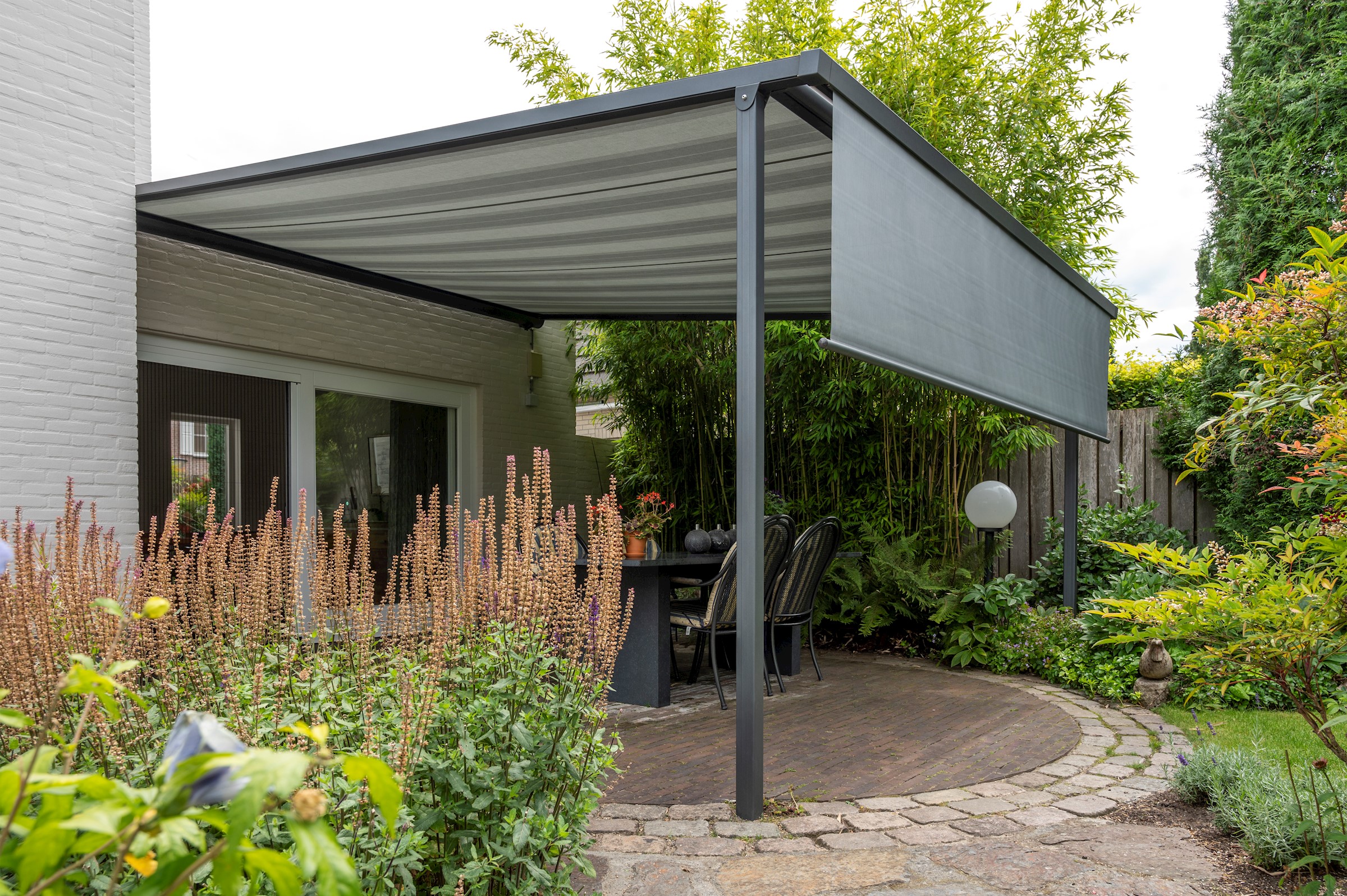 De Comfort-Line Pergola+ zip is een pergola zonwering met een aantal mooie accessoires. Ook is de verstevigingsbalk verplaatst en zit deze hier tussen de geleiders. In de horizontale aluminium balk kan optioneel een uitrolbare volant, sfeervolle LED-verlichting of een combinatie van beide worden toegevoegd.