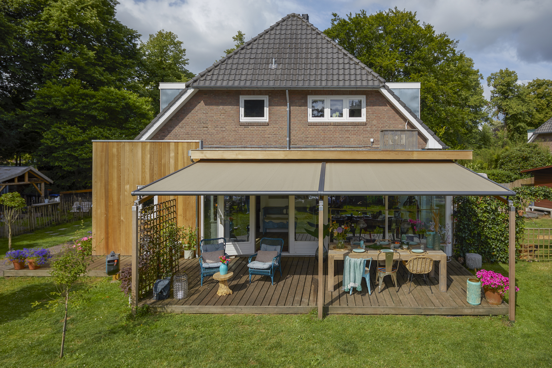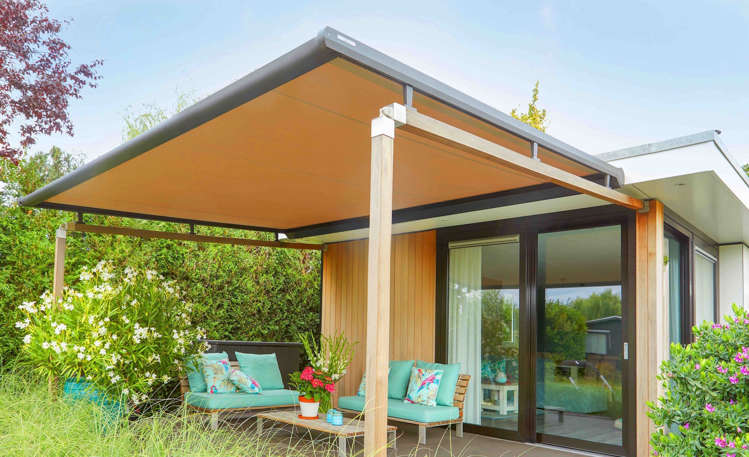 De Ambiance Comfort-Line WOOD zip: een unieke Pergola zonwering met houten palenconstructie.