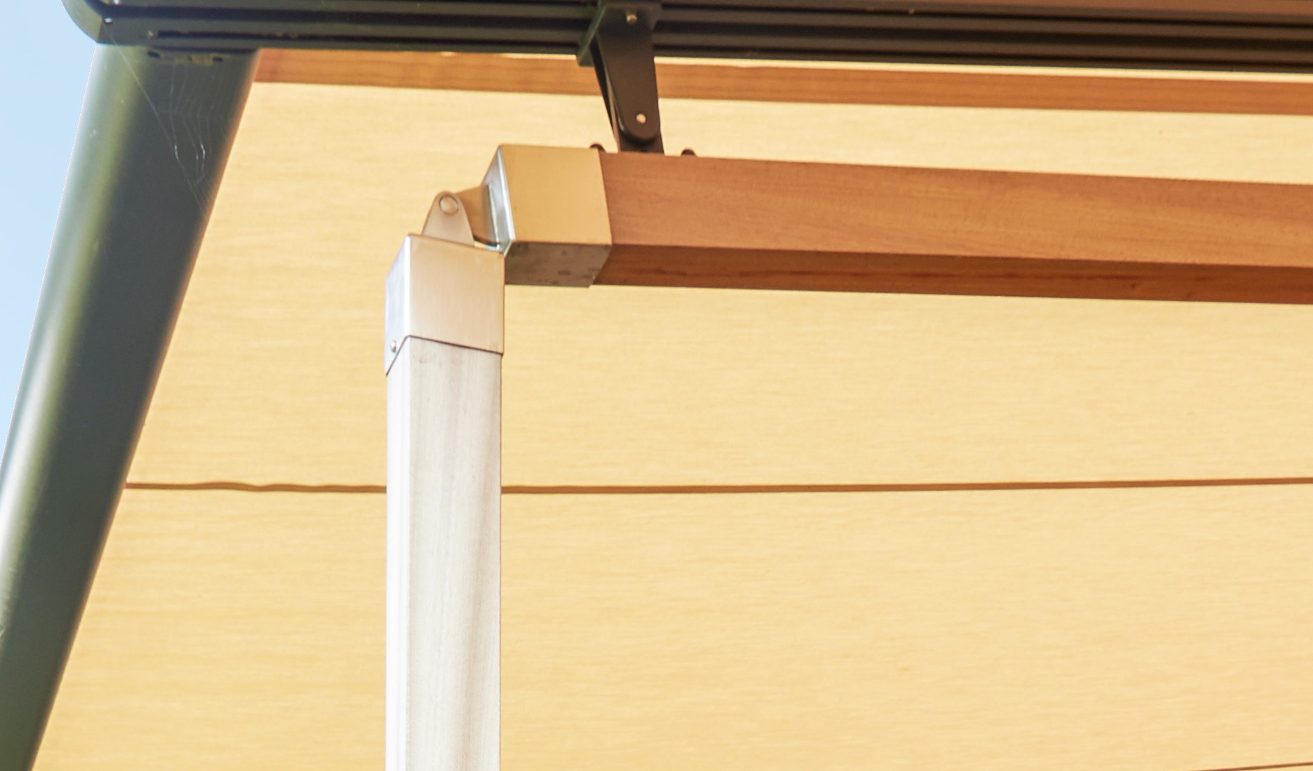 Ambiance pergola overkapping, textieldak Comfort-Line WOOD zip, close-up houten constructie